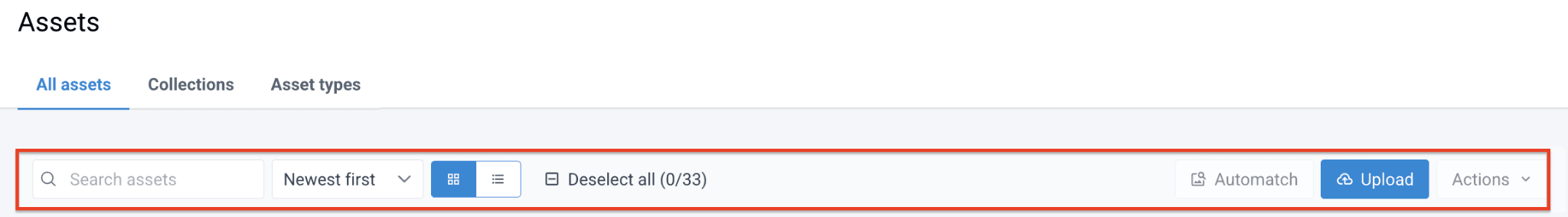 - Sorting the drop-down menu lets you change the order of the assets by Newest first, Oldest first, A-Z, Z-A.