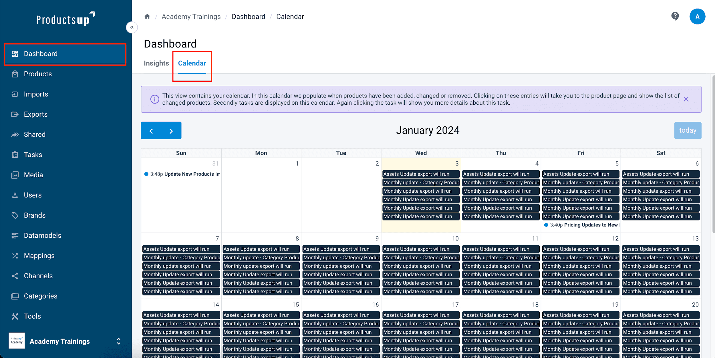 Calendar gives you an overview per date of the number of products that have been added, changed, or removed, and a list of tasks planned.