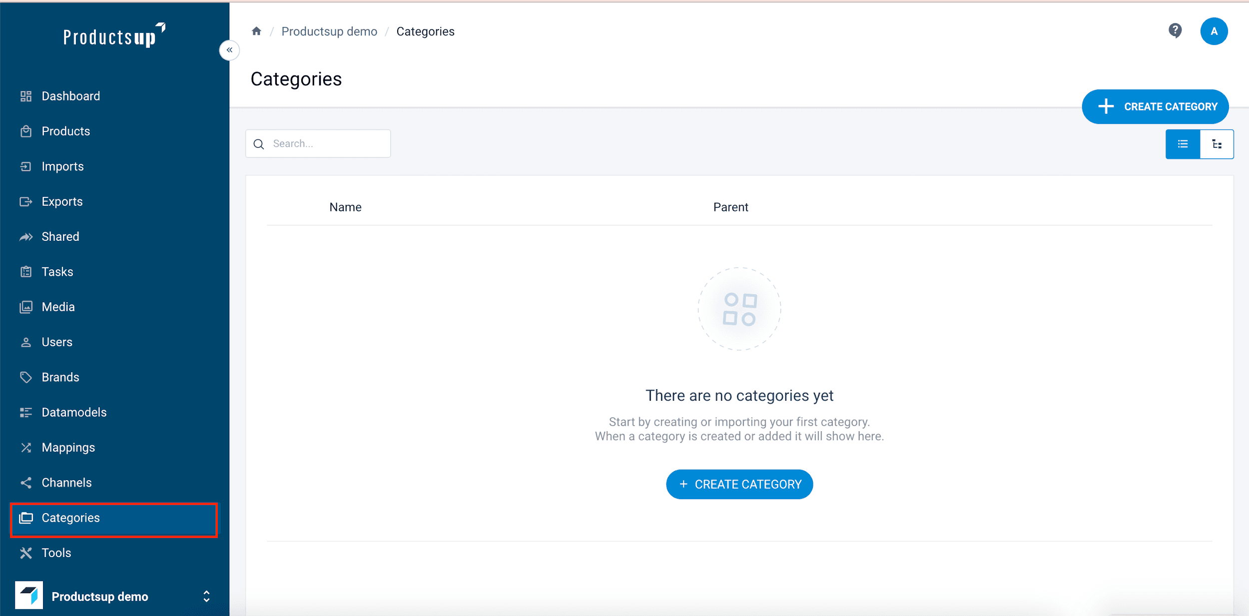 You can see the categories created for your organization. Categories can have subcategories. You can switch between the List view and Tree view: