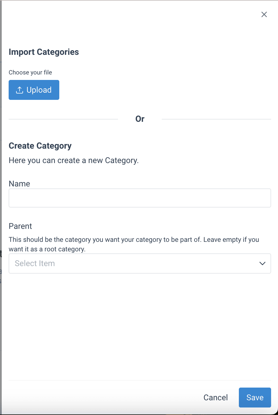 - Select the Create Category button in the top right corner of the page. A sidebar opens where you can either import a list of categories or create a new category by entering the information in the fields.