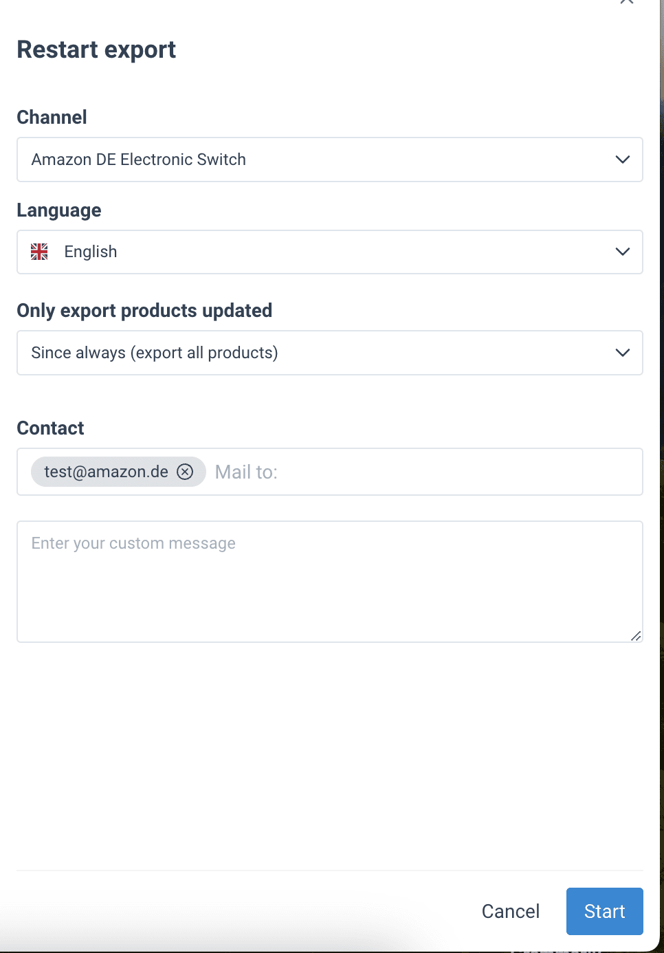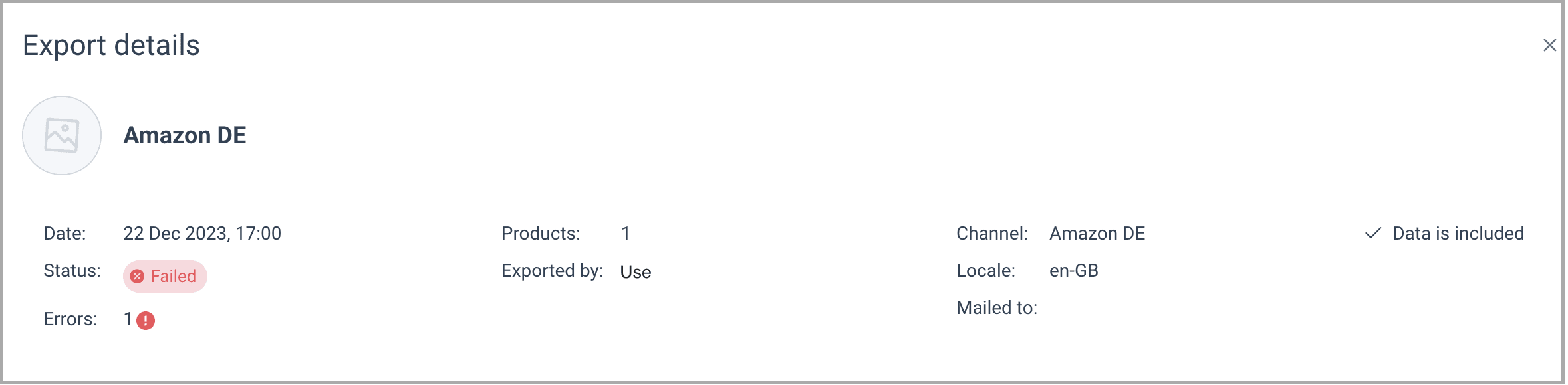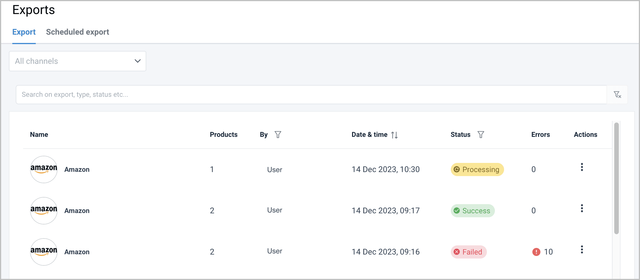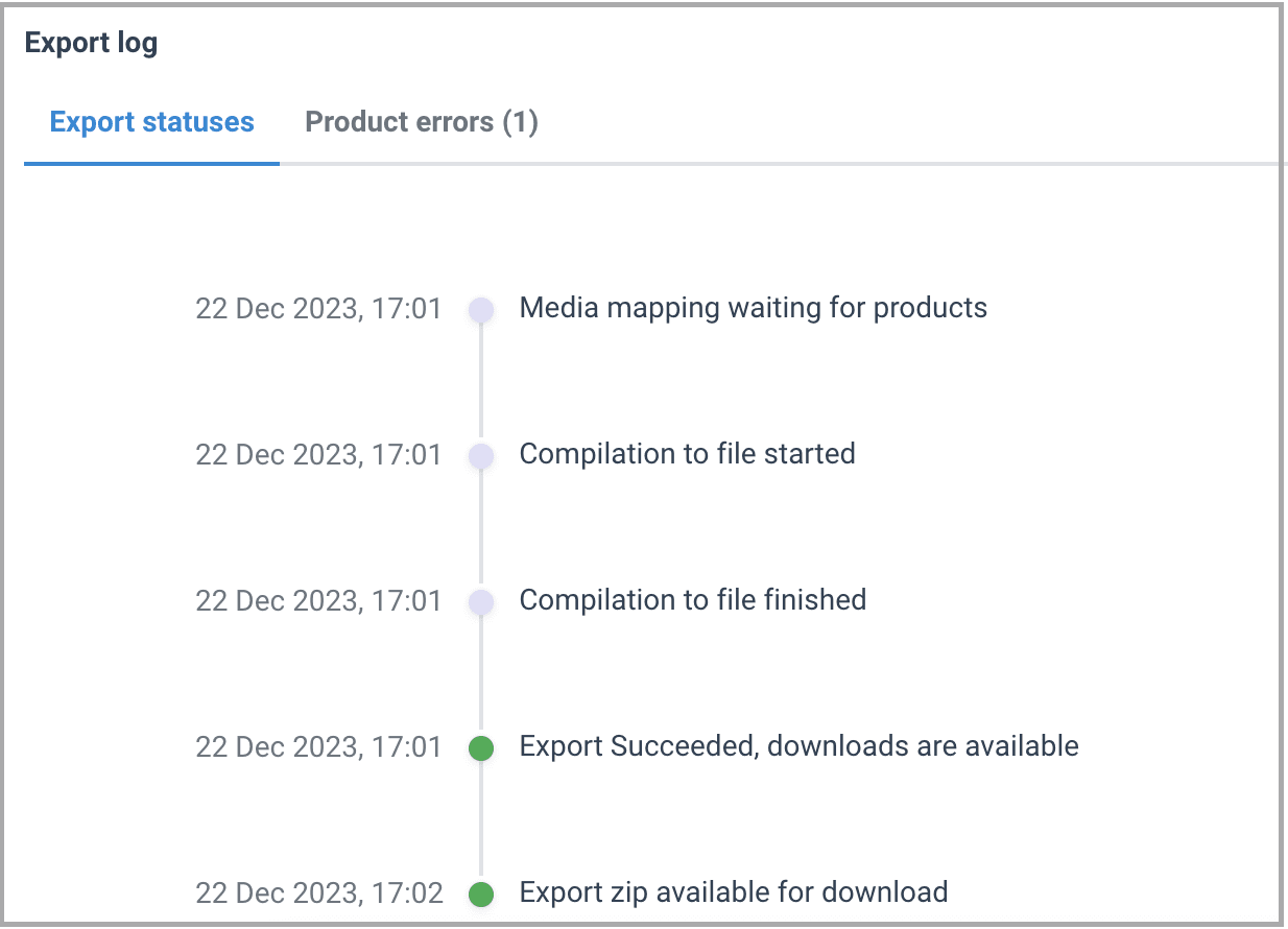 | Status | The current state of the export (can be used for sorting): • Pending: Initializing (approx. 1 minute). • Processing: Currently running. • Failed: Check Export log for errors. • Success: All products exported successfully. • Partial success: One or more products exported successfully. |