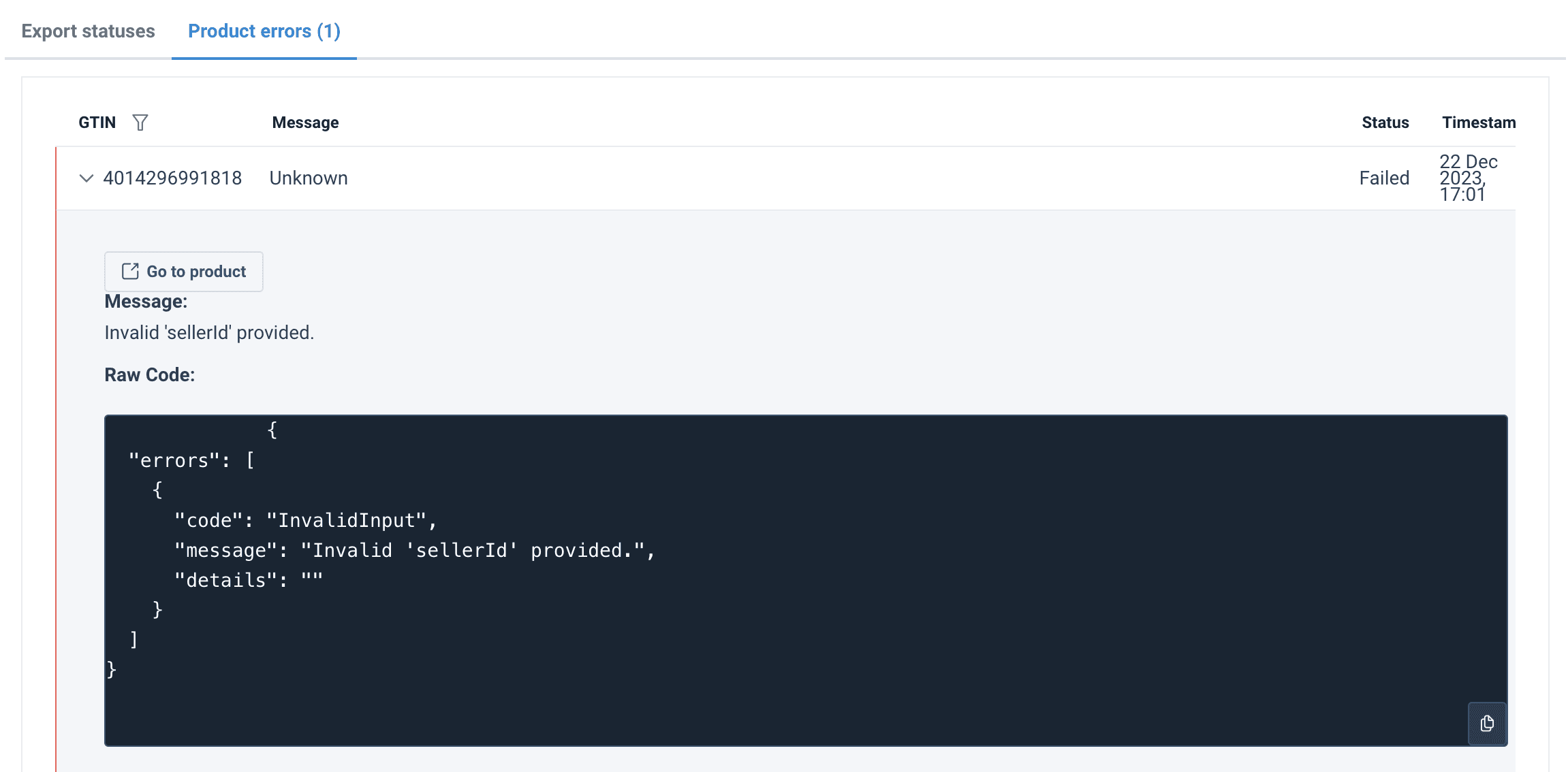 - Product errors - for now, this tab is available only for Amazon exports and lets you view the information about each product such as GTIN, Message containing the Submission ID from Amazon, Status, and Timestamp. You can also see the raw error code in JSON format. In case of an error, you can provide this information to Amazon directly to get help from their support.