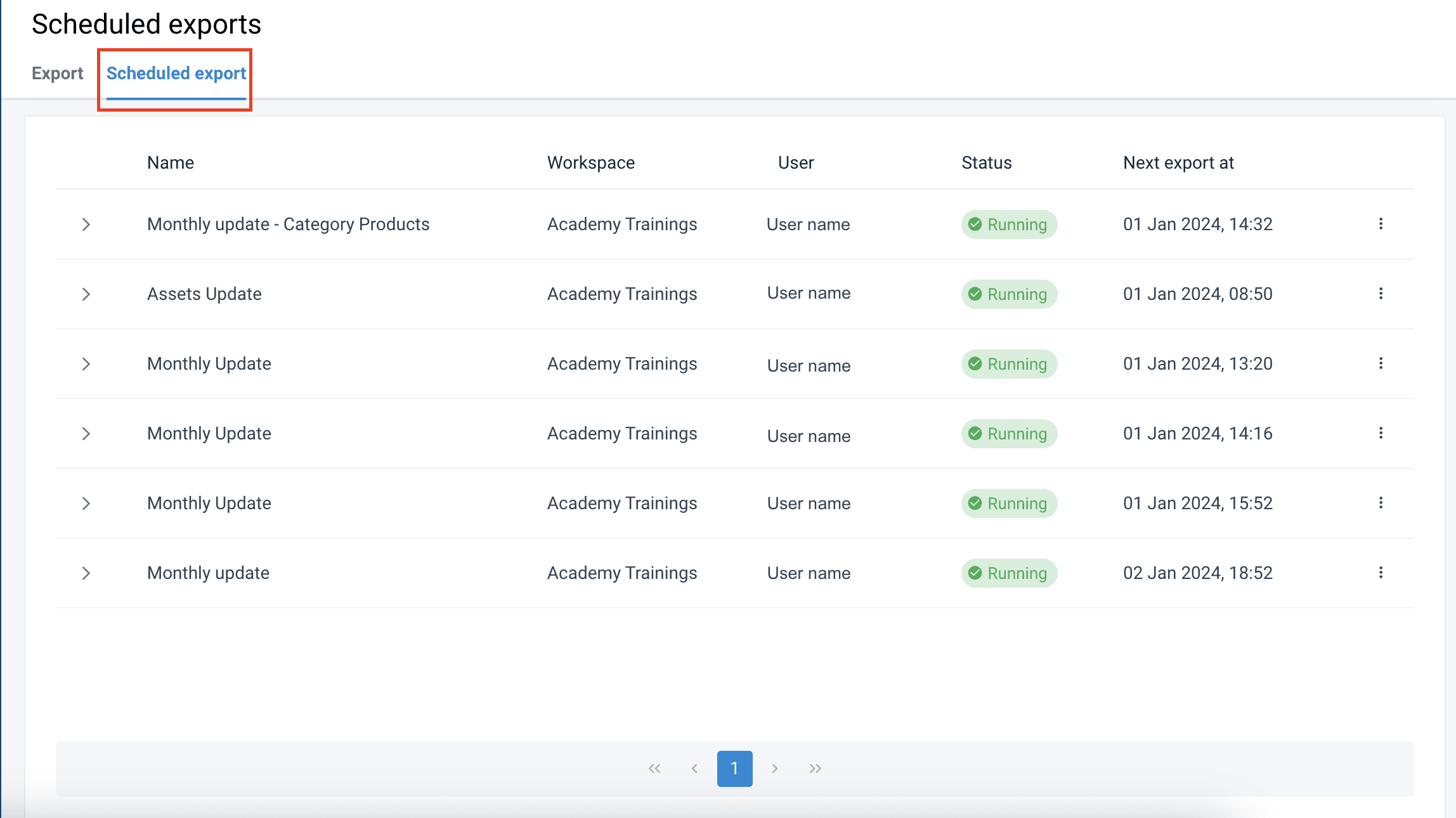 In the Scheduled export tab in Exports, you can see all exports scheduled for the future and exports to be repeated regularly.