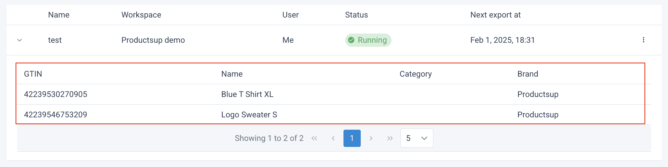 If you select the arrow at the beginning of an export row, you can see the products included in the export.