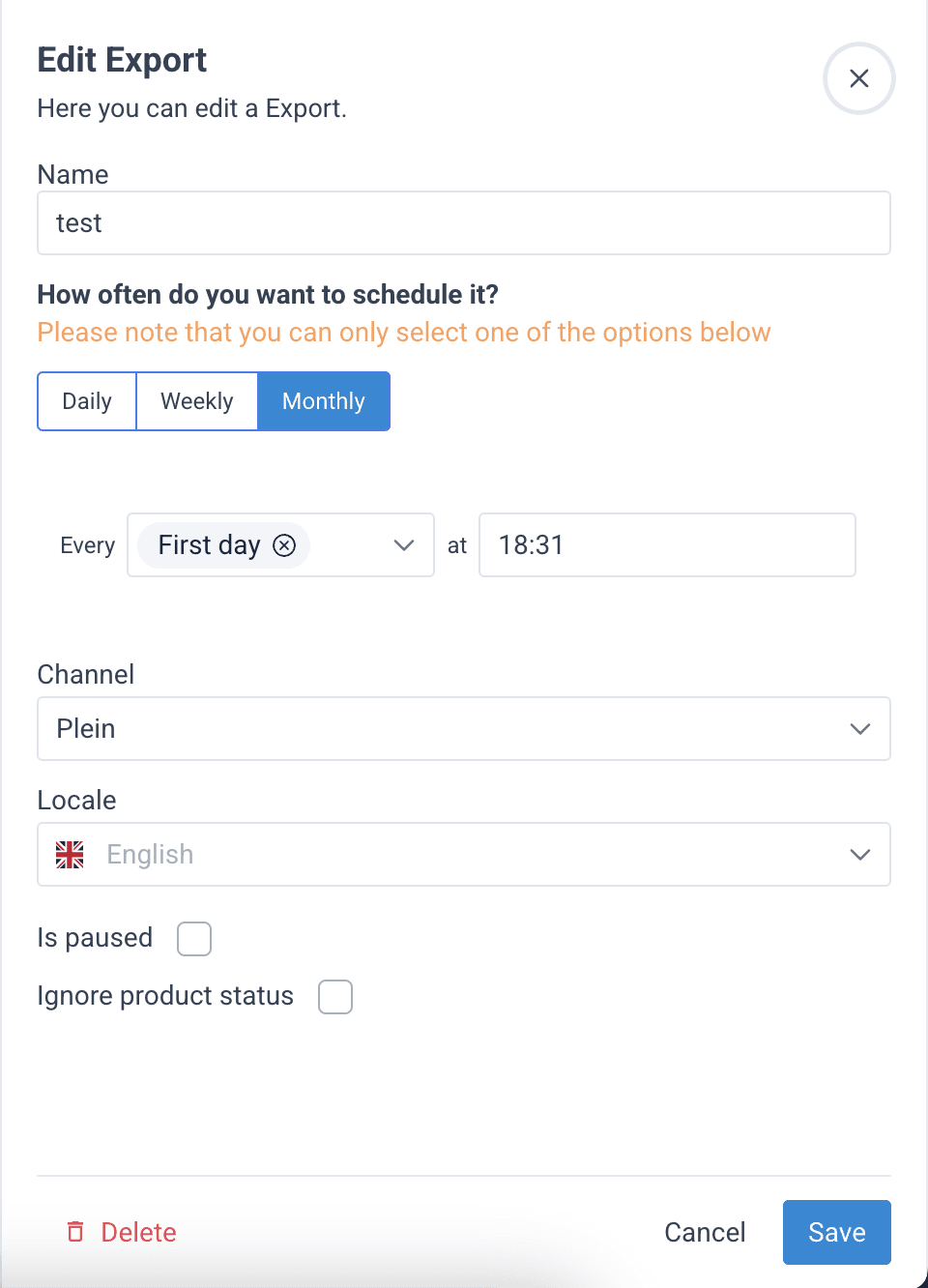 - Check or uncheck the box Is paused to pause or unpause the scheduled export.
