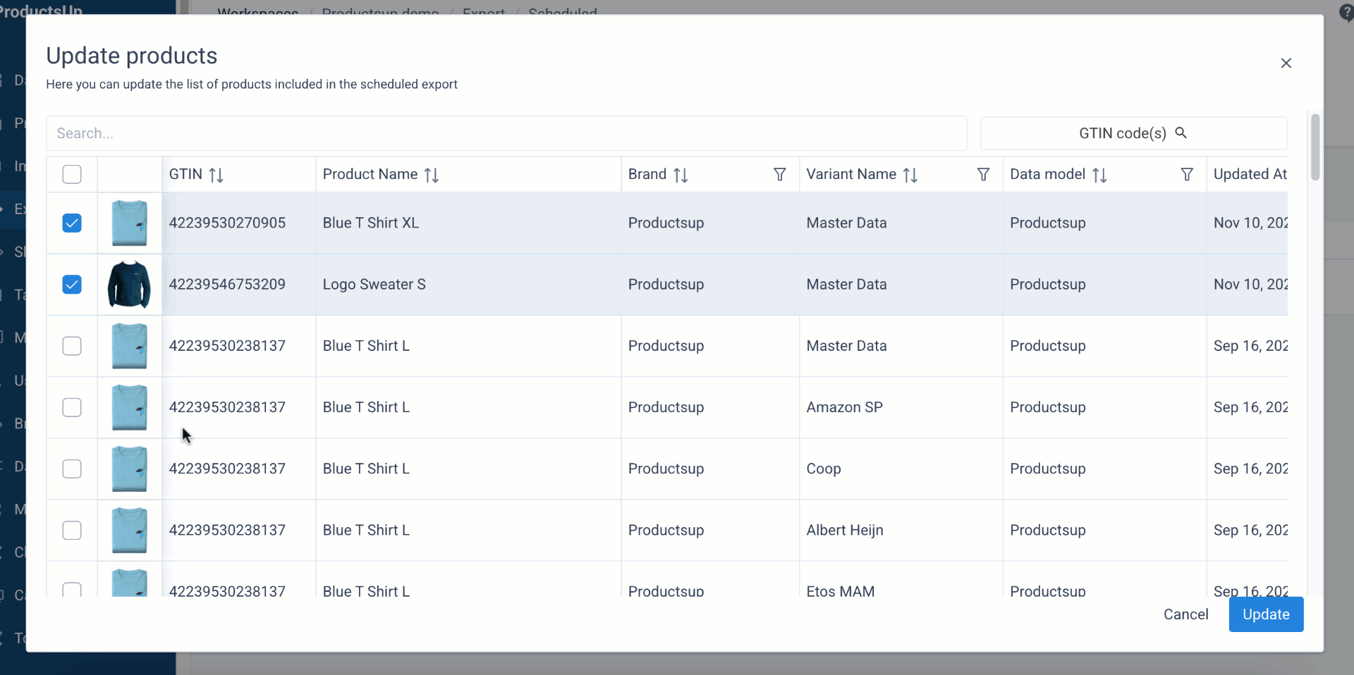 - In the pop-up window, check the boxes next to the products you want to include in the scheduled export and uncheck the boxes next to the products you want to remove. You can use the search bar or sort and filter the columns to find the needed products. When done, select Update.