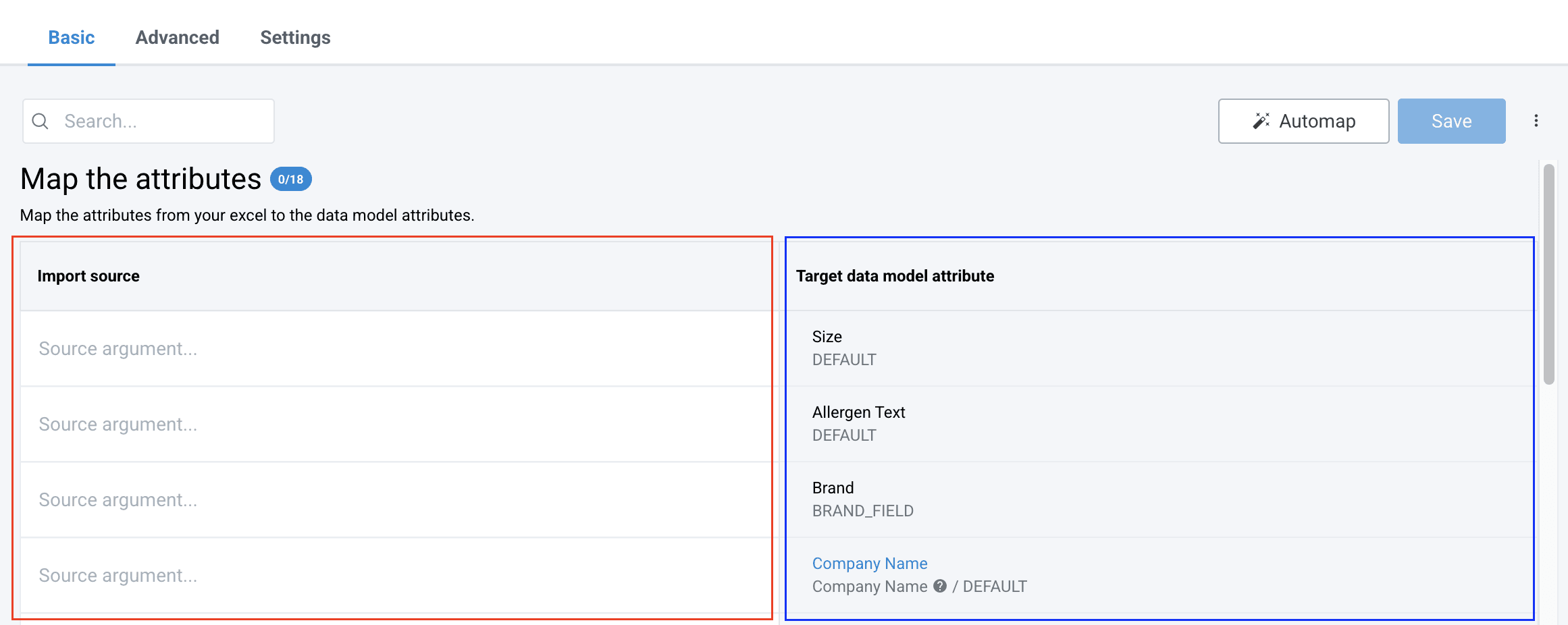 - On the import mapping setup page, map the attribute names from your imports (highlighted in red on the left) to the attribute names of the chosen data model (highlighted in blue on the right). You can map your attributes manually by entering attribute names from your imports in the Import source column. You can also use the automapping feature.