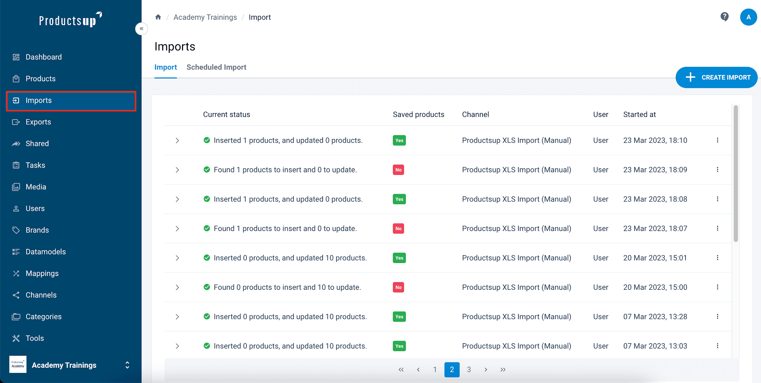 The Imports page shows all the imports that have been performed by your organization. Before reading this section you can also take a course about Imports and Exports on Productsup Academy.