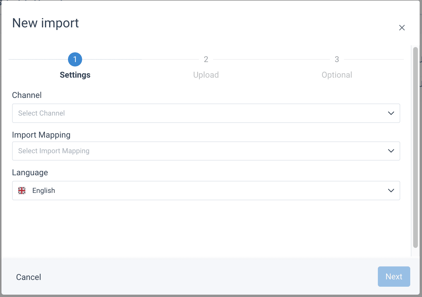 - In Language, you can choose the language that your import will be provided in from the search bar which comes up when the field is clicked. This will be automatically filled if a standard language has been set before.