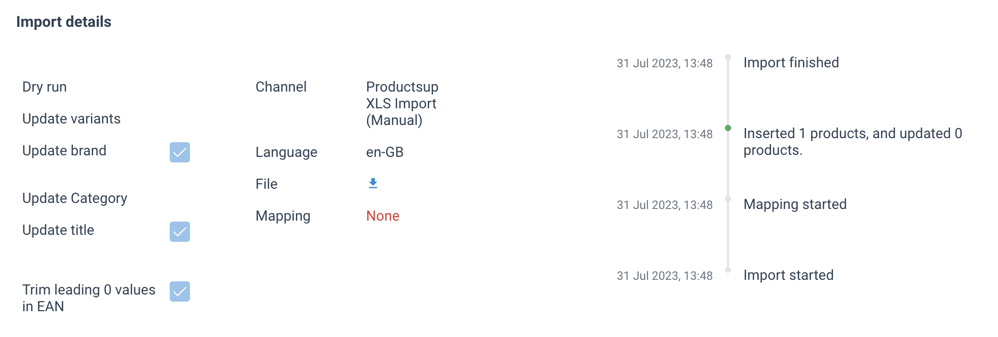 | Dry run | If checked, the import was a test. Products are processed to check for faults but are not imported into the system. |