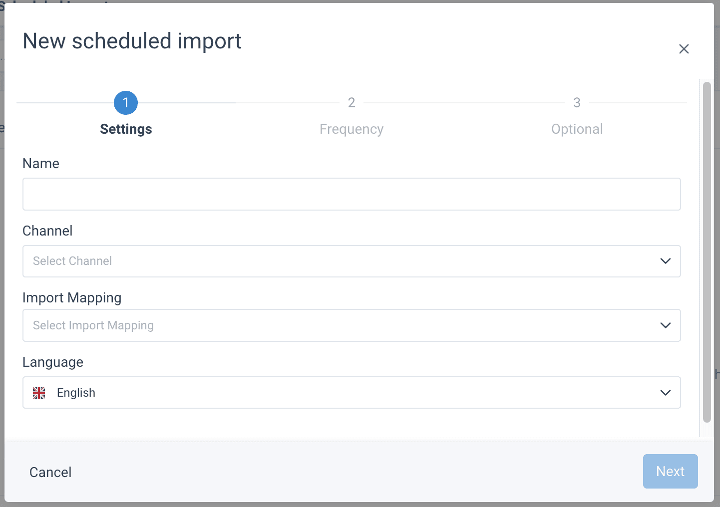 - The New scheduled import pop-up ones where you need to add or select the necessary information: