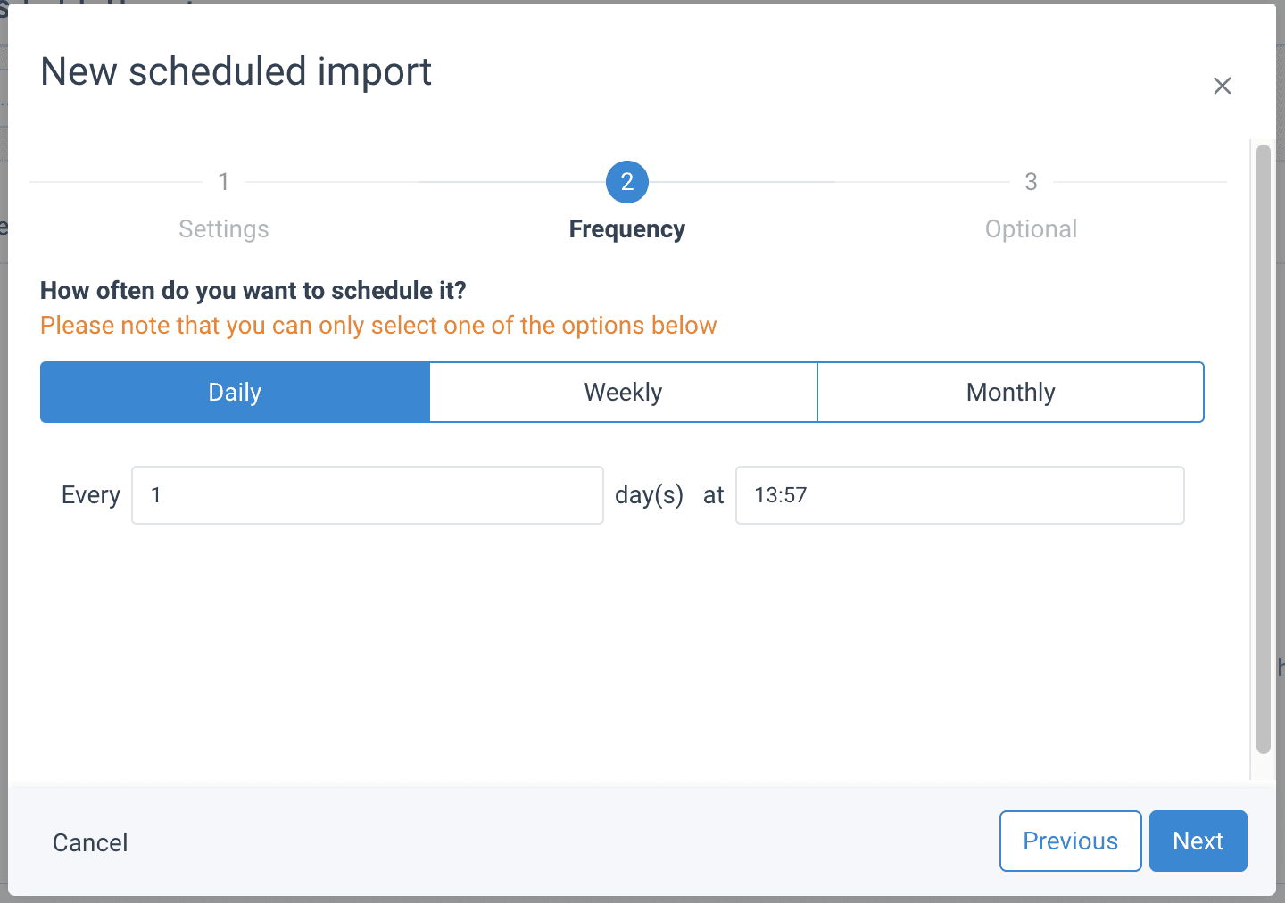 - In Frequency, select how often the import should repeat: