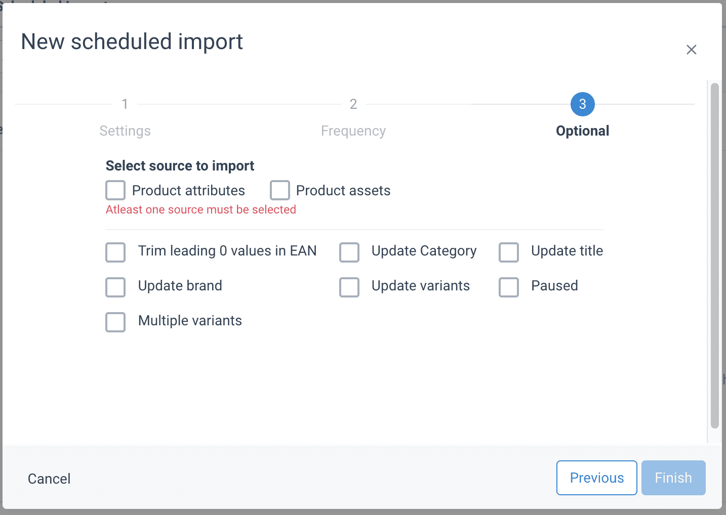 - Select at least one source to import: Product attributes or Product assets.