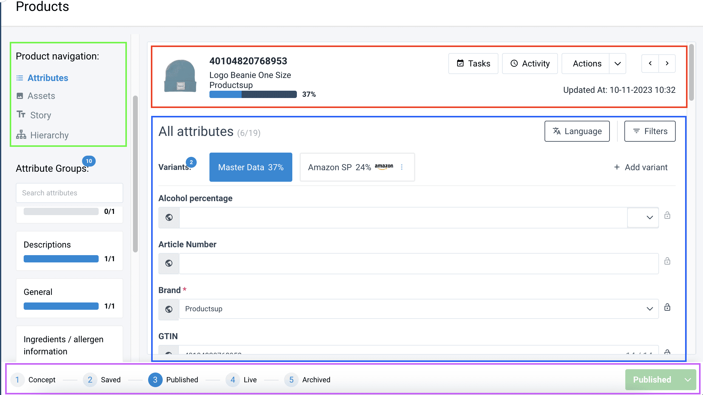At the top of the page, you can see the product's image, GTIN, name, and the percentage of the product information completed depending on the selected variant.