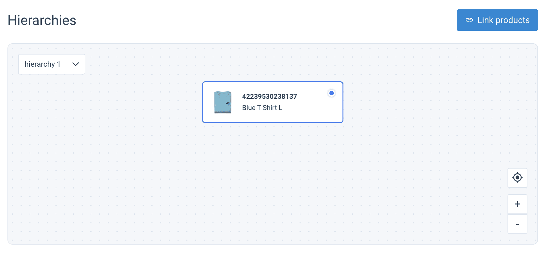 When you select the Hierarchy option in the Product navigation menu, the Hierarchies section opens where you can view the hierarchies of products and link the products with their quantities.