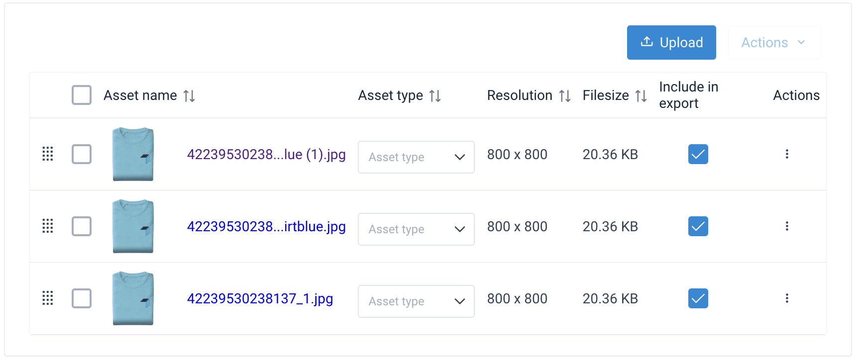 - The column Include in export lets you select what assets in the list should be included in exports.