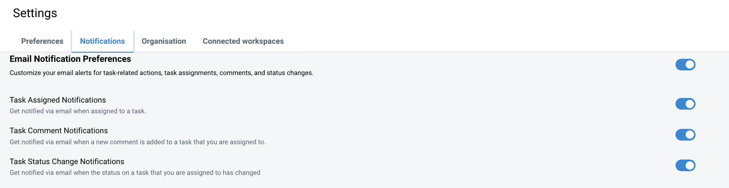 - Task Comment Notifications: This option lets you get email notifications of new comments and reactions posted to the tasks assigned to you.