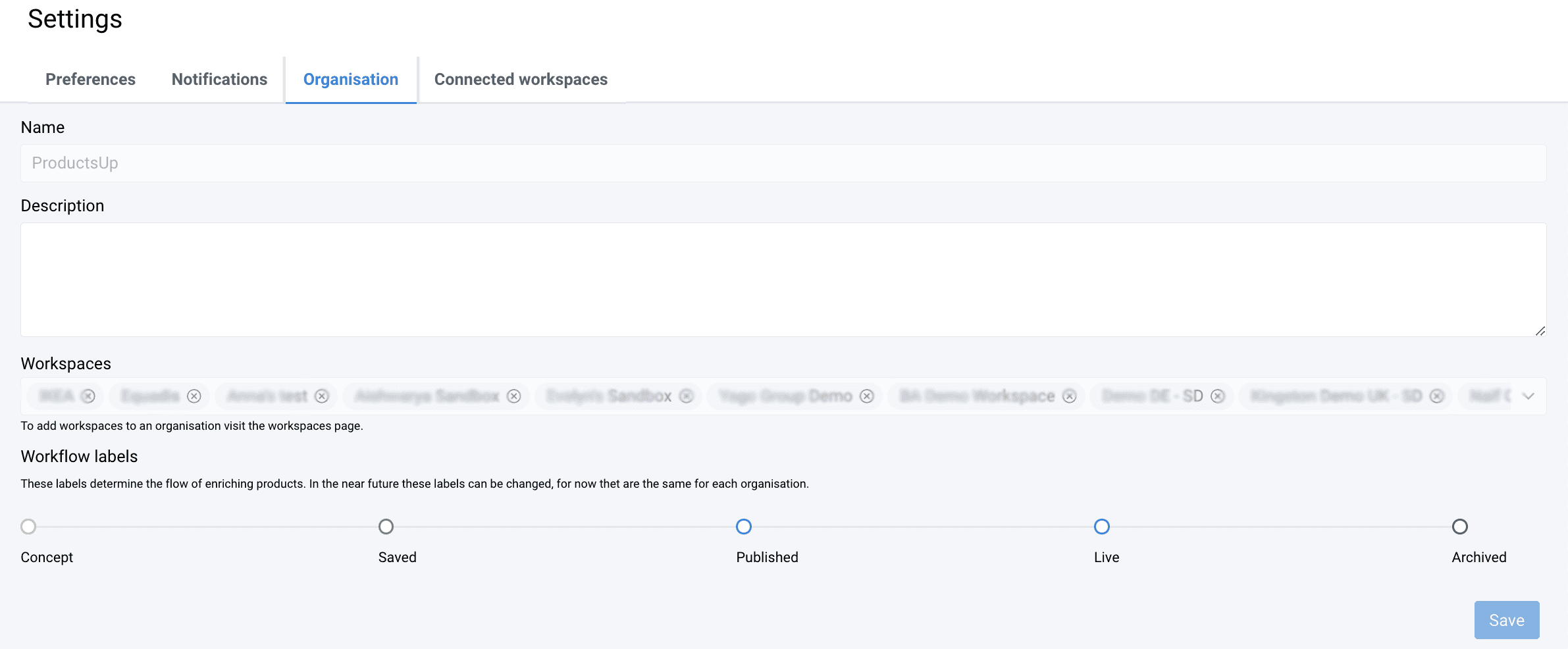 | Workflow labels | Standardized statuses that define the product enrichment process: • Concept: Initial product draft. • Saved: Data is committed to the database. • Published: Data is visible to clients and shared workspaces. • Live: The product is active and live. • Archived: Product is removed from circulation but data is retained. |
